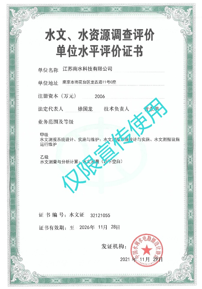 评价证书的内容包括南水科技在水文测报系统设计、实施与维护范围内:水文测报系统设计与实施甲级、水文测报设施运行维护甲级;在水文测量与分析计算范围内:水文测量乙级。该项证书的取得,拓展了南水科技水文水资源相关领域的服务范围,提升了服务能力,为公司持续服务水利行业以及地方经济社会发展提供了坚实基础。